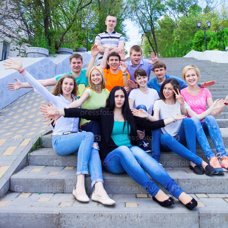 Группа улыбающихся подростков на лестнице
