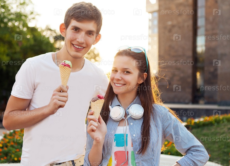 Молодая красивая пара подростков с мороженым