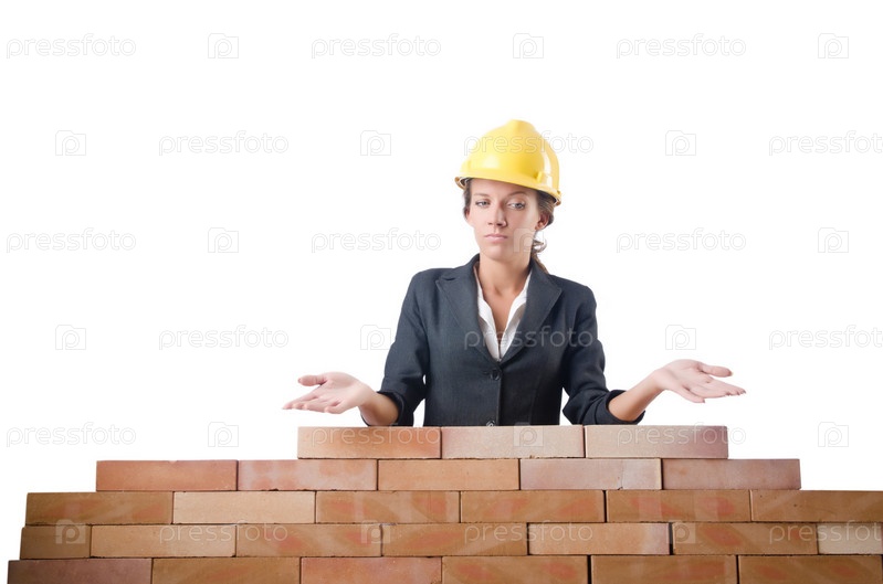 Строитель возле кирпичной стены
