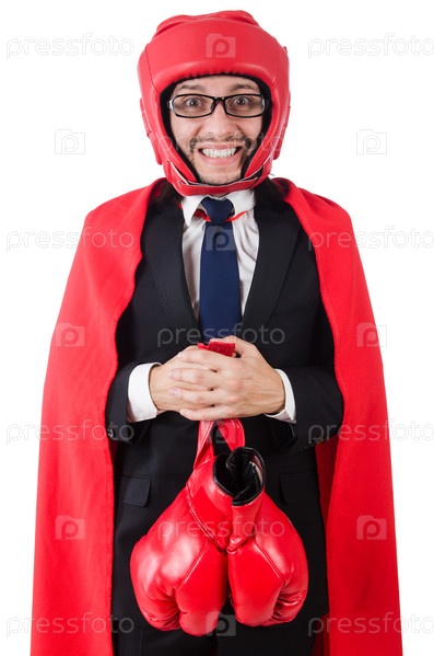 Бизнесмен в накидке и боксерских перчатках