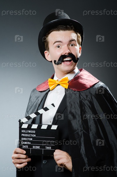 Забавный мужчина с кинохлопушкой