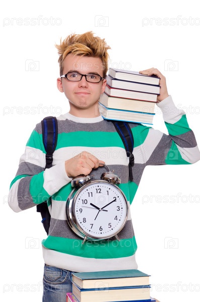 Смешной студент со стопкой книг
