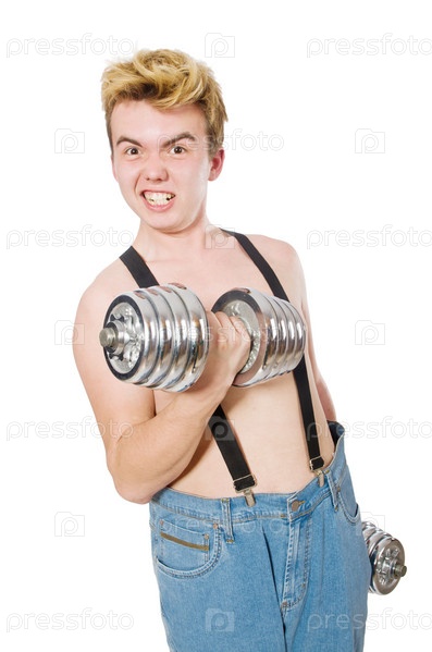 Забавный человек с гантелями