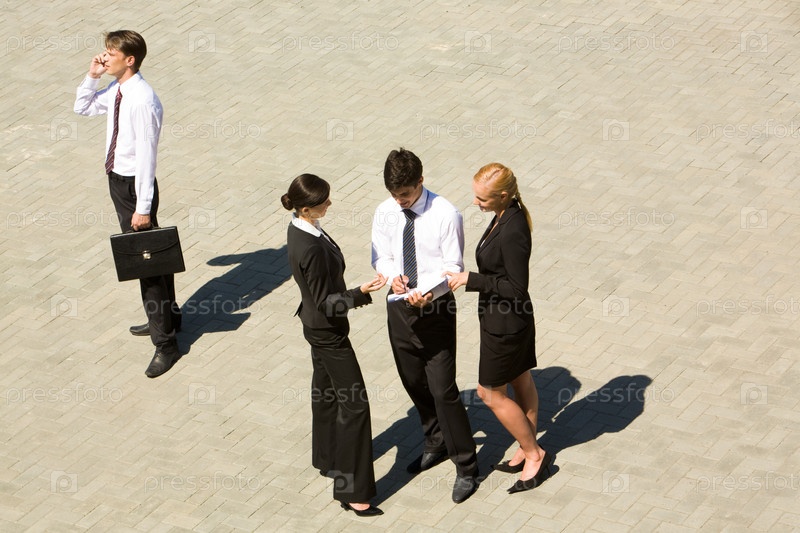 Изображение уверенных в себе деловых людей, обсуждающих что-то на открытом воздухе