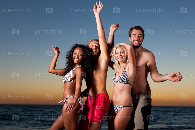 Группа друзей веселится на пляже