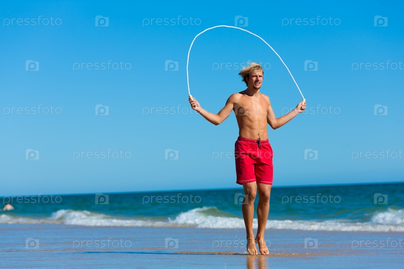 Молодой человек прыгает через скакалку