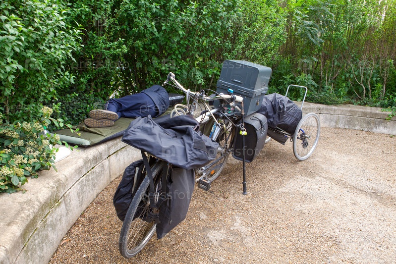 Спящий бродяга и велосипед с вещами на улице Парижа