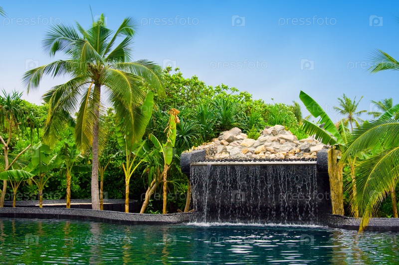 Бассейн с небольшим водопадом в тропическом саду, Мальдивы