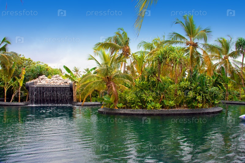 Бассейн с небольшим водопадом в тропическом саду, Мальдивы