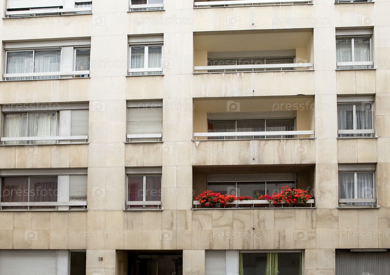 Балкон с красными цветами в многоквартирном доме