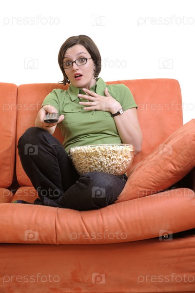 Молодая женщина ест попкорн и смотрит телевизор