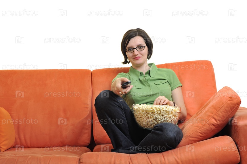 Молодая женщина ест попкорн и смотрит телевизор