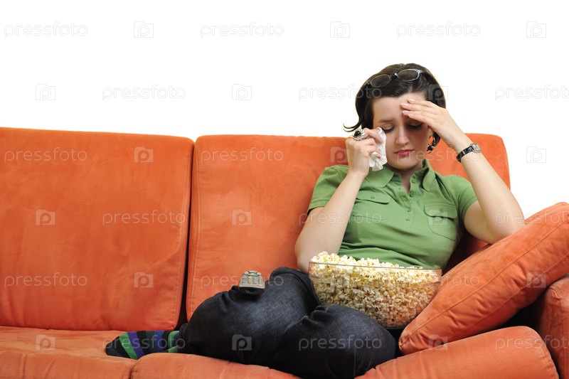Молодая женщина ест попкорн и смотрит телевизор