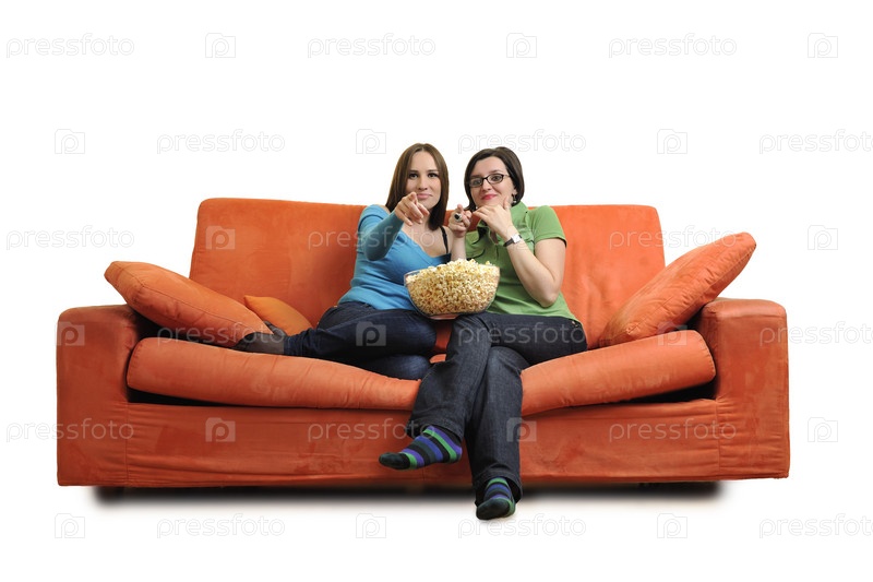 Подруги едят попкорн и смотрят телевизор