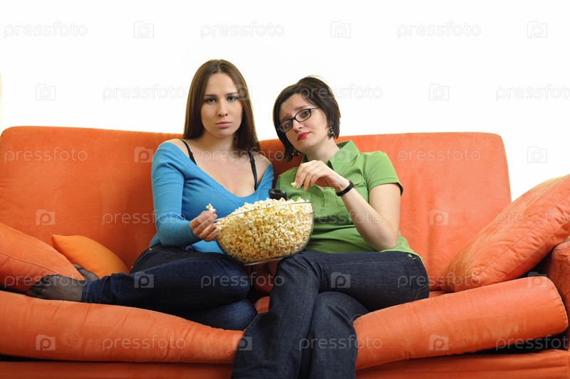 Подруги едят попкорн и смотрят телевизор