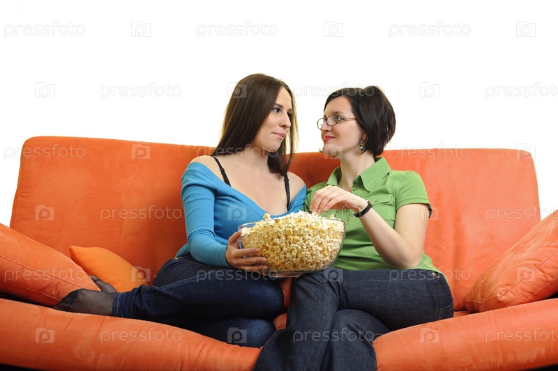 Подруги едят попкорн и смотрят телевизор