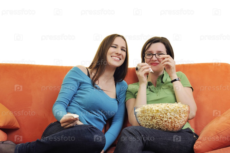 Подруги едят попкорн и смотрят телевизор
