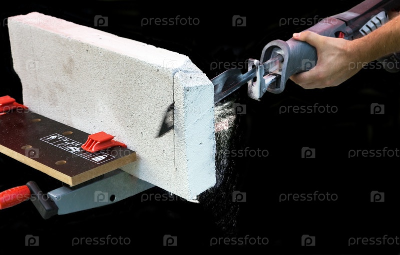 Рука человека пилит бетон на черном фоне