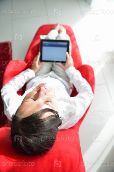 Женщина с планшетом на диване