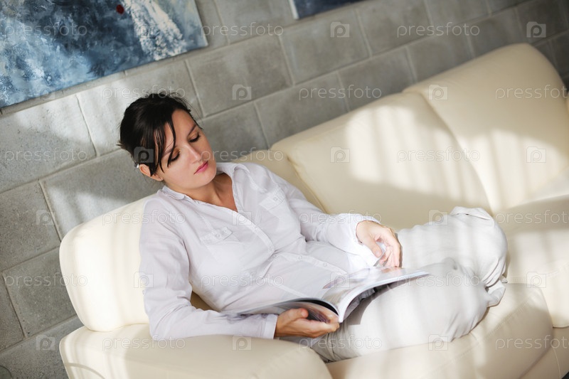 Женщина читает журнал дома