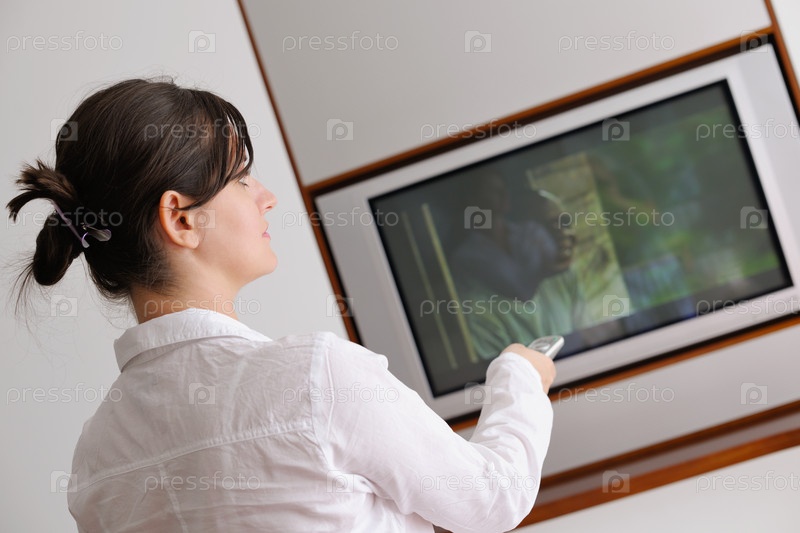 Молодая женщина смотрит телевизор