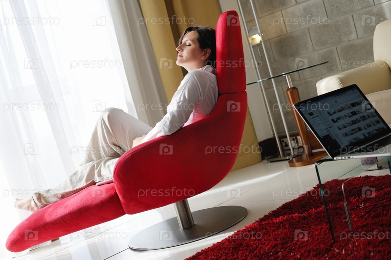 Счастливая молодая женщина отдыхает дома на диване
