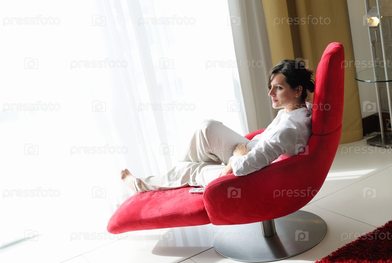 Счастливая молодая женщина отдыхает дома на диване