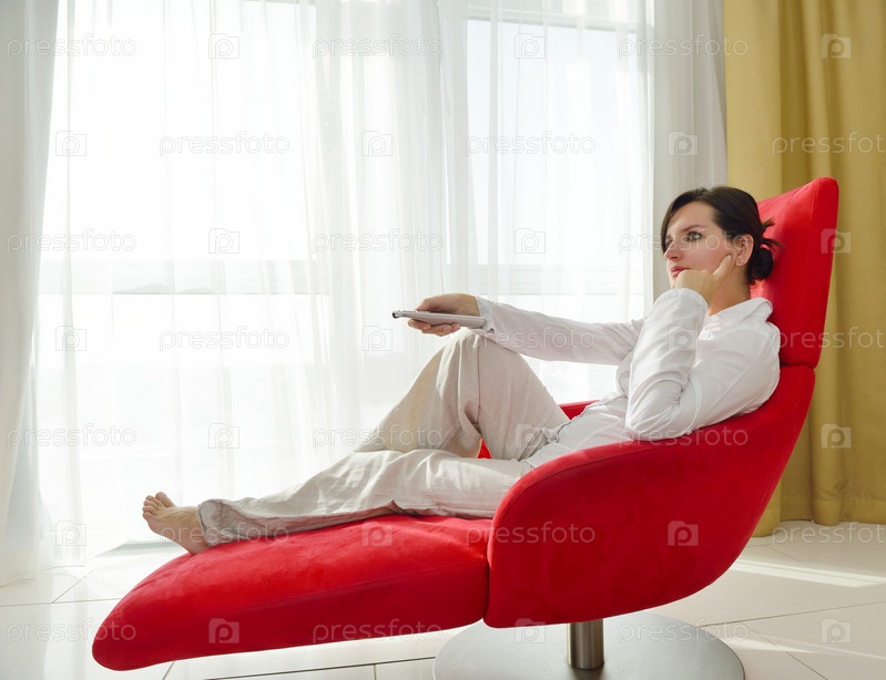 Молодая женщина смотрит телевизор