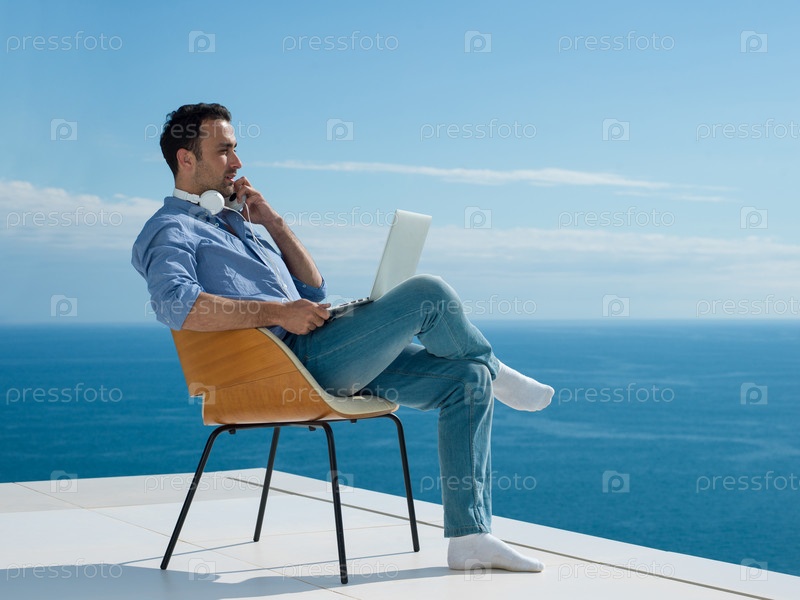 Молодой мужчина с ноутбуком на балконе