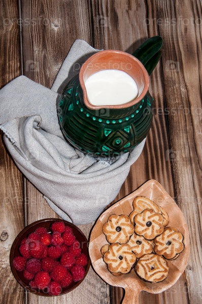 Малина, печенье и кувшин молока