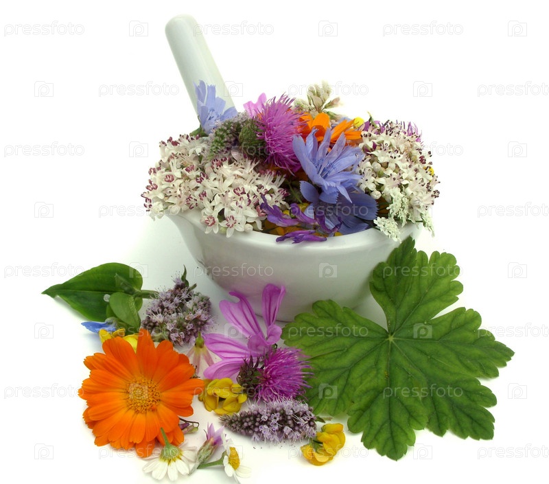 Цветущие лекарственные травы в ступке