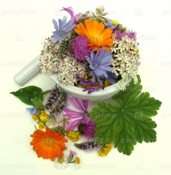 Цветущие лекарственные травы в ступке