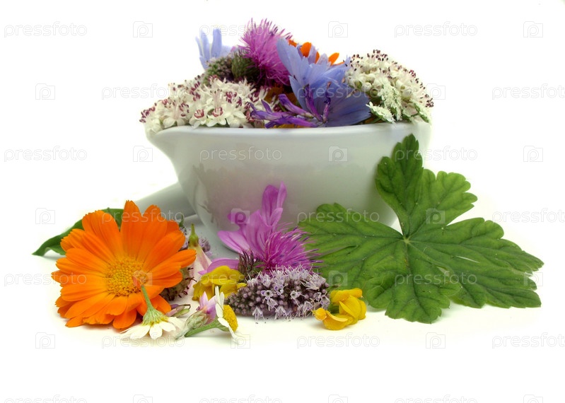 Цветущие лекарственные травы в ступке
