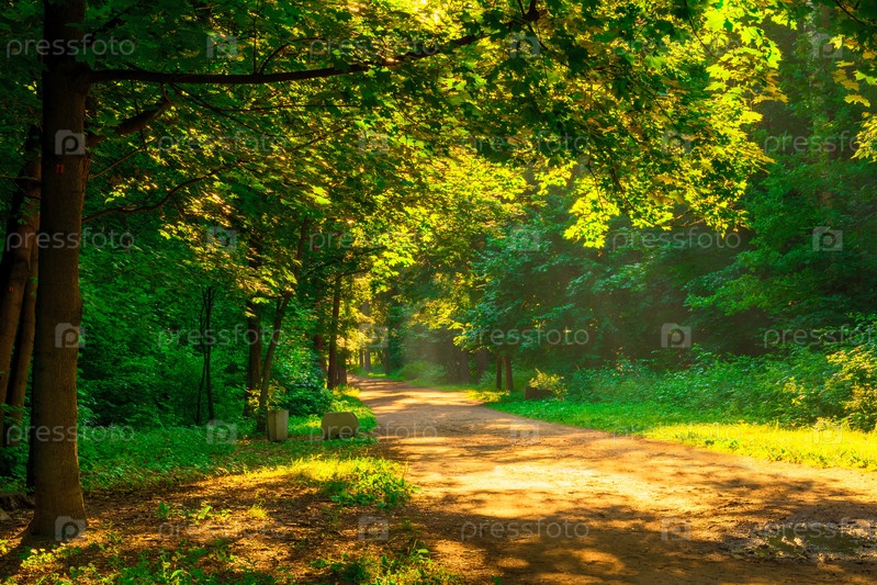 Лучи утреннего солнца освещают парк
