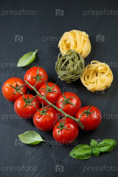 Помидоры, сырые тальятелле и базилик