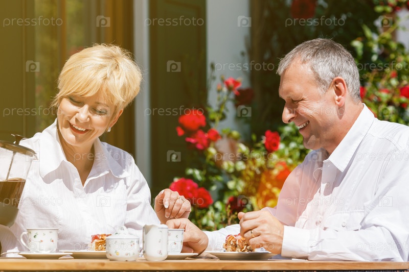 Пожилая супружеская пара пьет кофе в саду