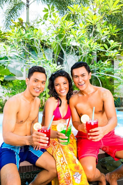 Азиатские друзья у бассейна