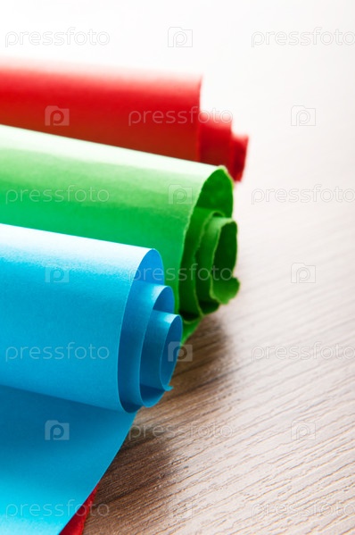 Полоски скрученной цветной бумаги на деревянной поверхности