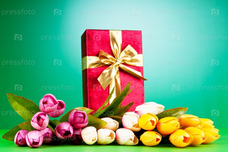 Подарочная коробка и тюльпаны на зеленом фоне