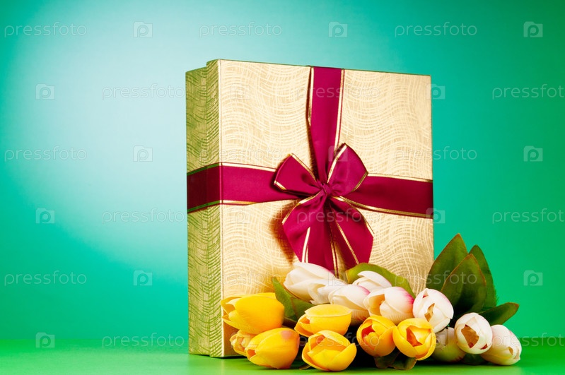 Подарочная коробка и тюльпаны на зеленом фоне