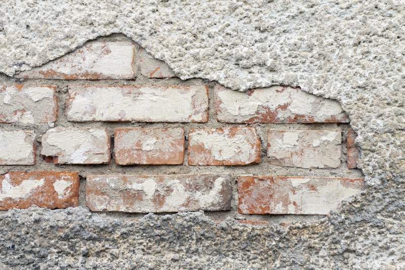 Старые стены из красного кирпича с отвалившейся штукатуркой