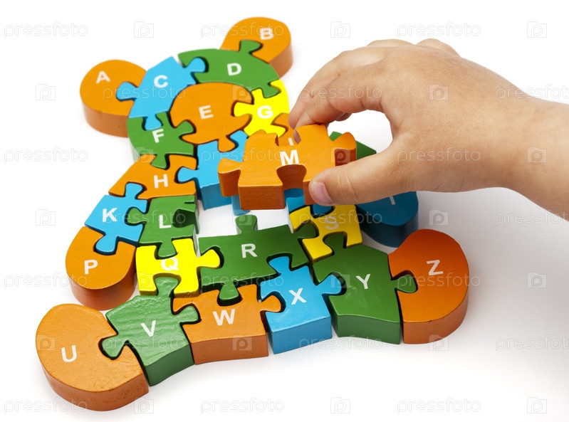 Детская рука собирает деревянную цветную головоломка в форме медведя с буквами