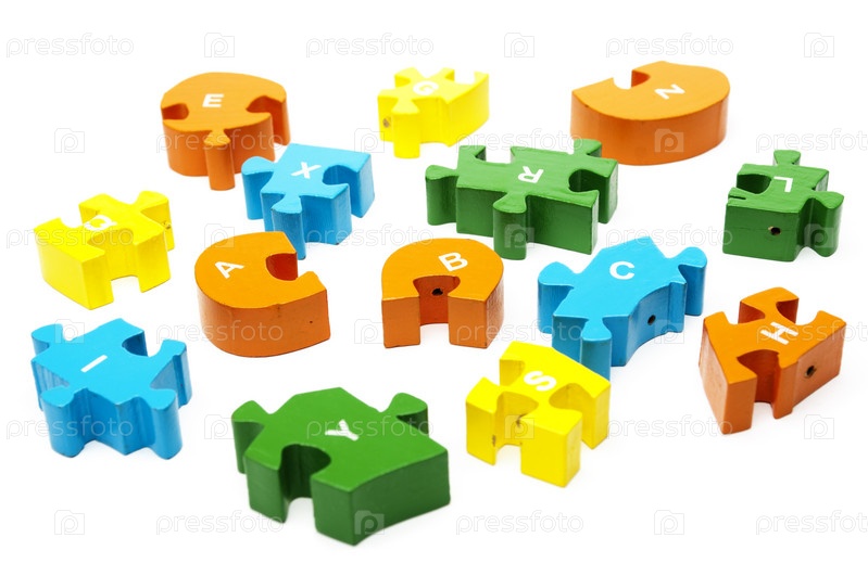 Элементы деревянной цветной головоломки на белом фоне