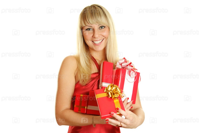 Счастлива блондинка в красном платье с подарками на белом фоне