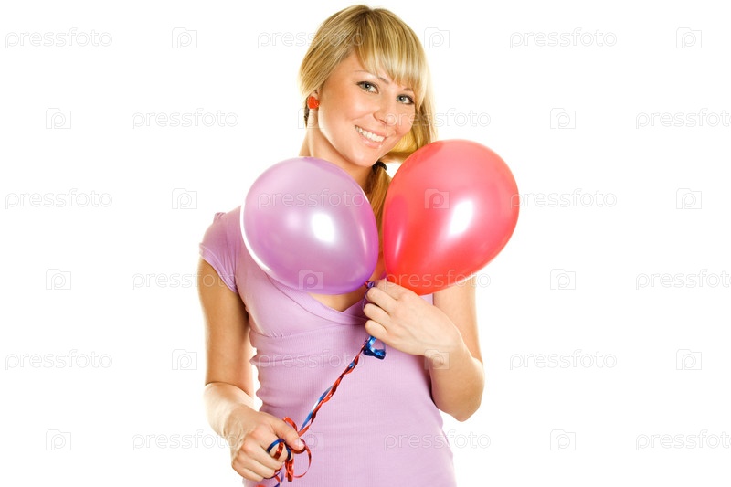 Счастлива блондинка с воздушными шарами на белом фоне