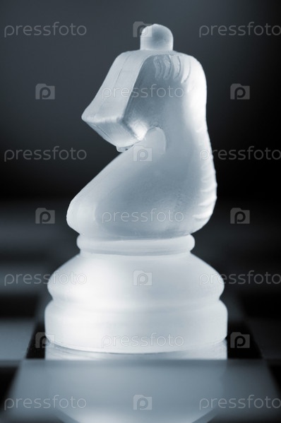 Белый прозрачный шахматный конь на игровом поле в темноте