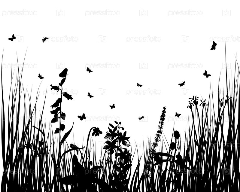 Бабочки на цветочном лугу, черно-белая иллюстрация