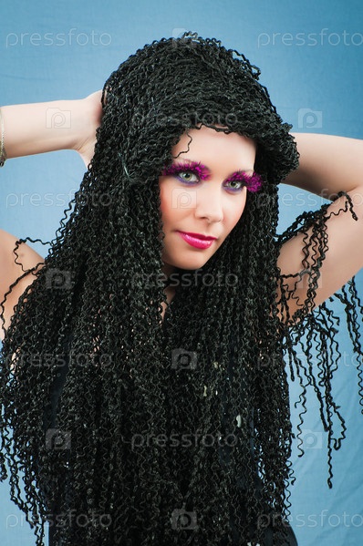 Портрет брюнетки с длинными волосами на голубом фоне