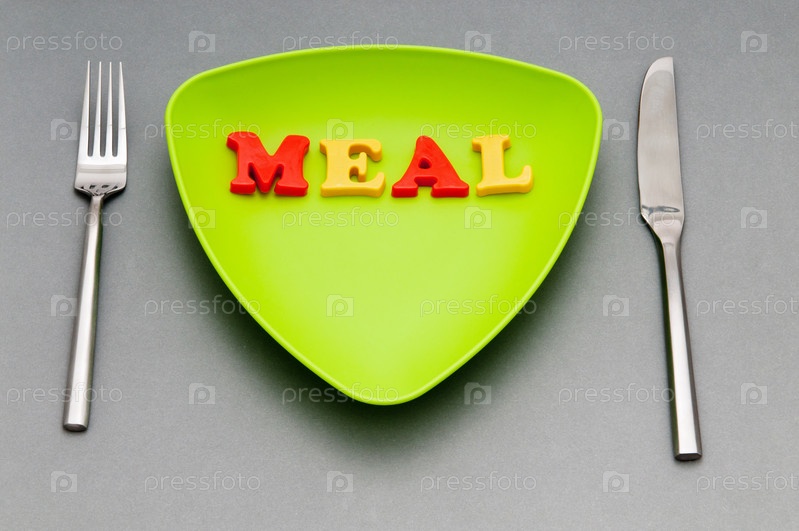 Тарелка с буквами MEAL на сером фоне