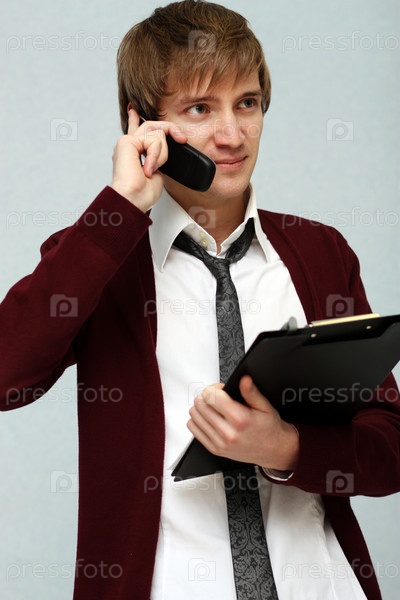 Молодой бизнесмен с планшетом разговаривает по мобильному телефону